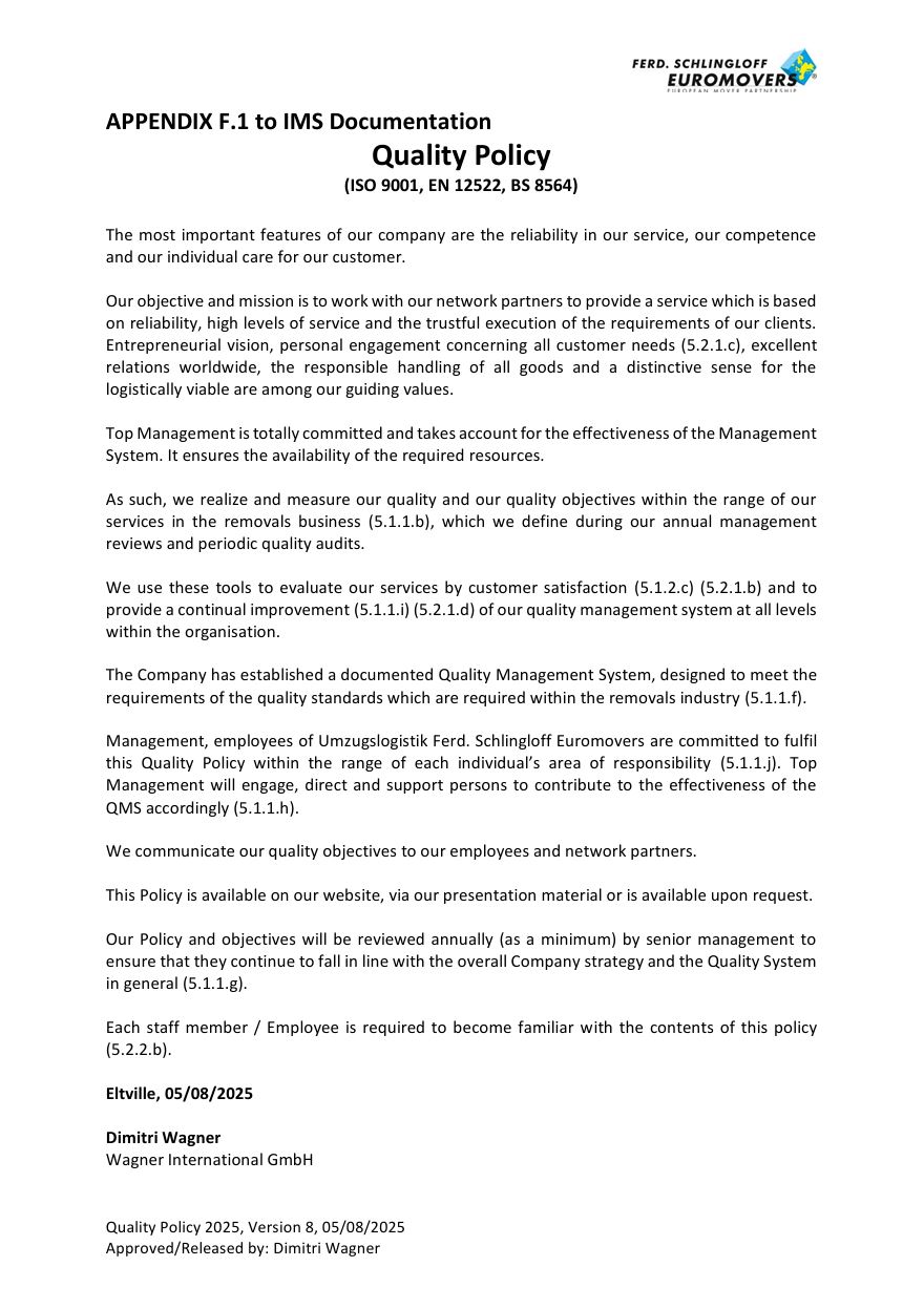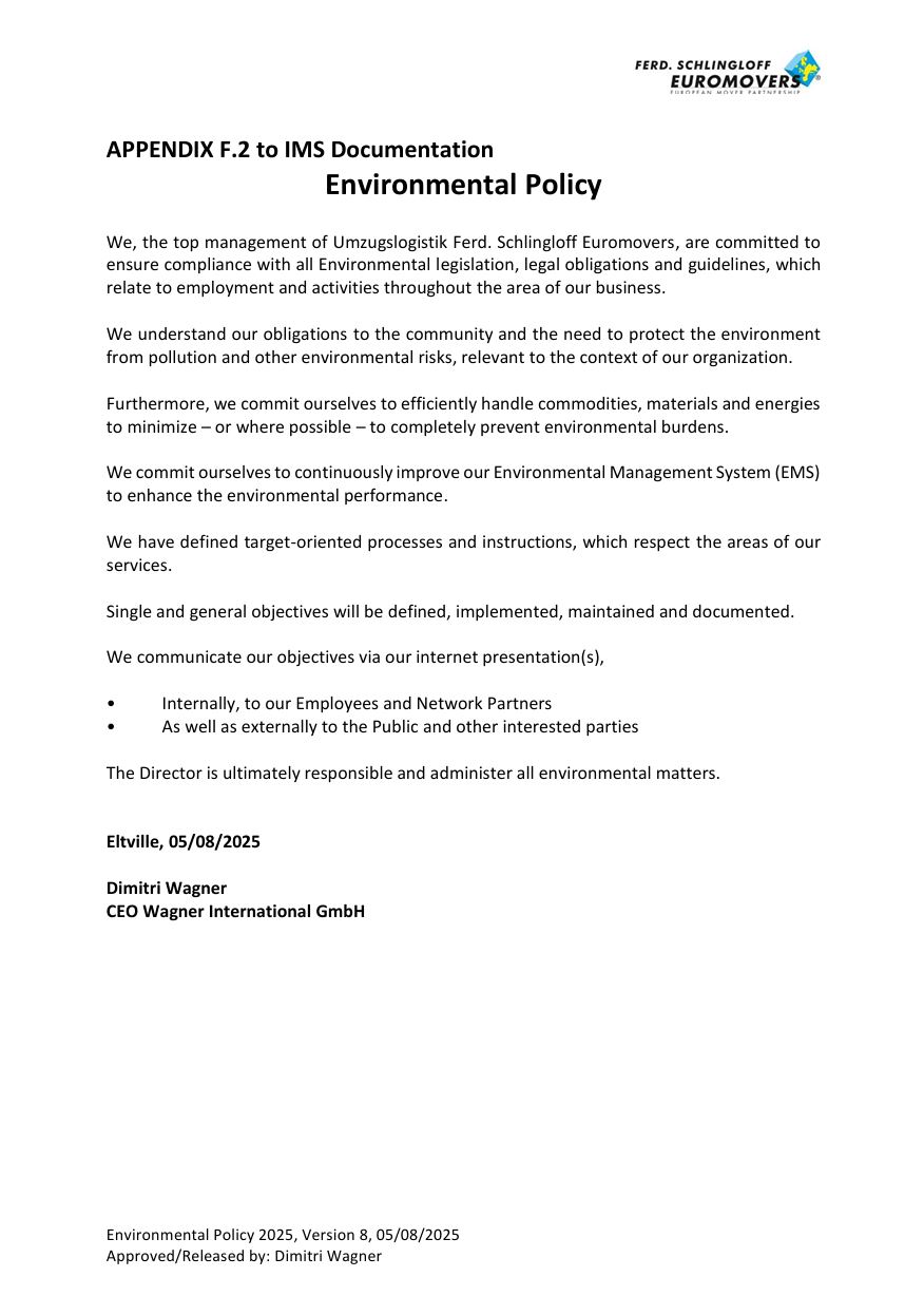 Das Unternehmen Ferd. Schlingloff wurde im Jahre 1907 von dem gleichnamigen Ferdinand Schlingloff am Standort Frankfurt am Main gegründet. Dort wurde das traditionsreiche Unternehmen 2013 von Dimitri Wagner, dem aktuellen Geschäftsführer, übernommen. Er vernetzte Ferd. Schlingloff mit dem Internationalen Netz der Euromovers, wodurch wie Sie überall und jederzeit mit vollster Zufriedenheit umziehen können! 2021 wurde die Umzugslogistik Ferd. Schlingloff zur Marke der Wagner International GmbH.